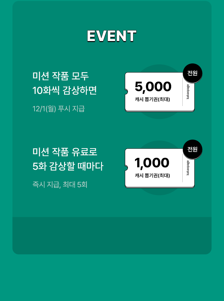 - 미션 작품 모두 10화씩 감상하면 최대 5,000캐시 뽑기권 (전원, 12/1(월) 푸시 지급)