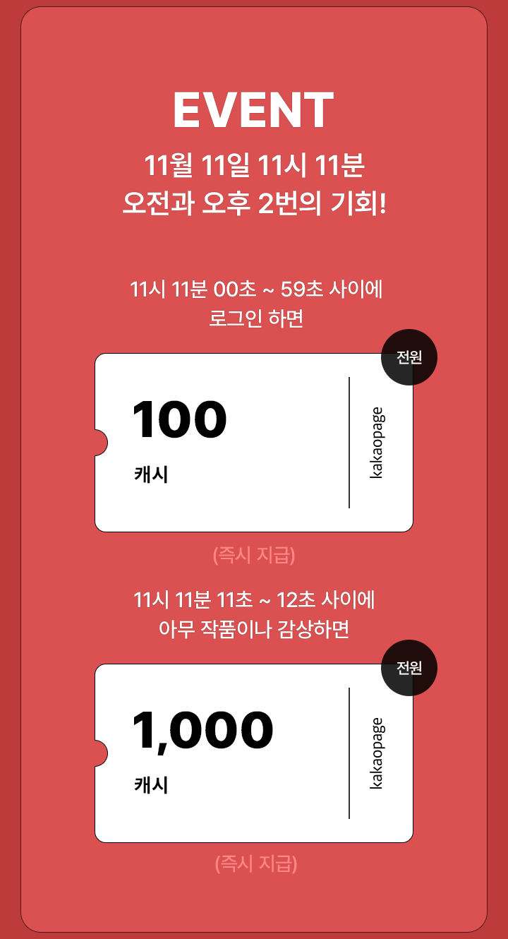 - 오전(AM) 11시 11분 00초부터 11시 11분 59초까지 카카오페이지에 로그인 하면 100캐시를 받을 수 있습니다. (전원, 즉시 지급)