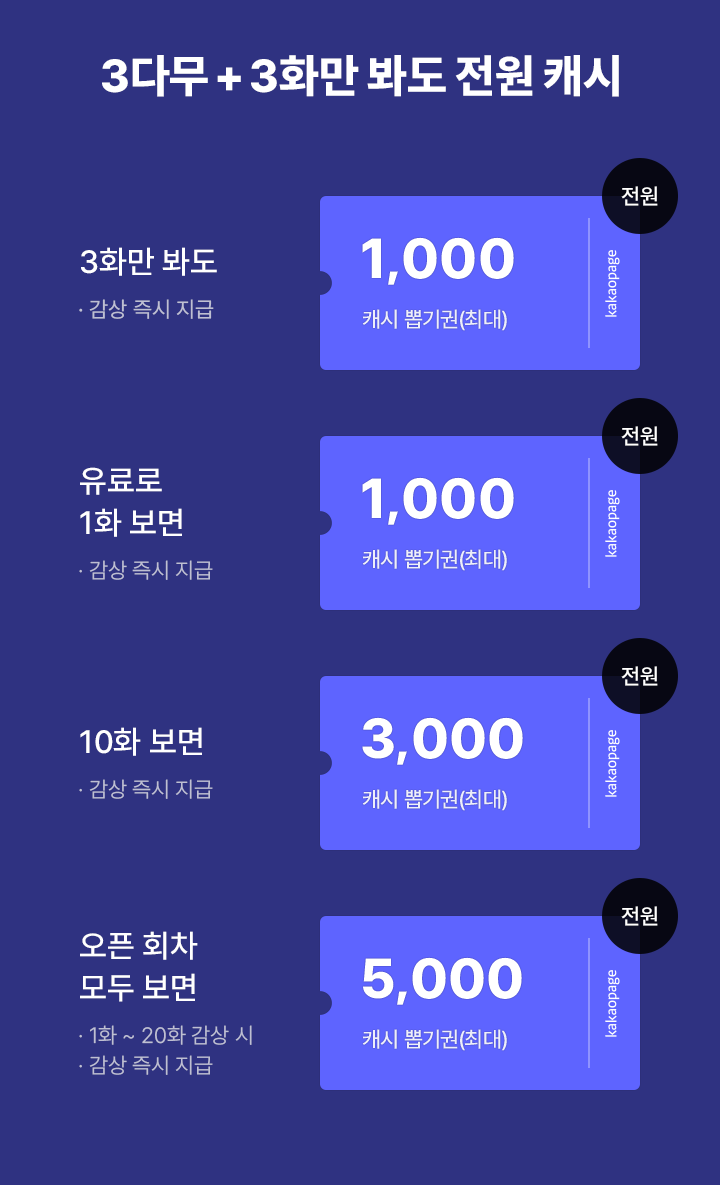 3화만 봐도 최대 1,000캐시 뽑기권 (전원, 감상 즉시 지급)