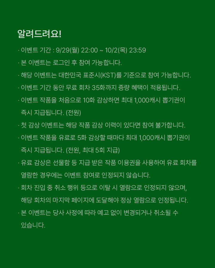 유료 감상은 선물함 등 지급 받은 작품 이용권을 사용하여 유료 회차를 열람한 경우에는 이벤트 참여로 인정되지 않습니다.