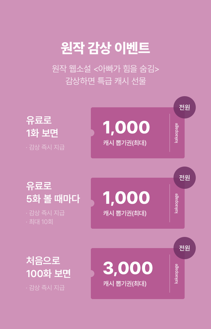 - 웹소설 <아빠가 힘을 숨김> 유료로 5화 감상할 때마다 최대 1,000캐시 뽑기권이 즉시 지급됩니다. (최대 10회 지급)