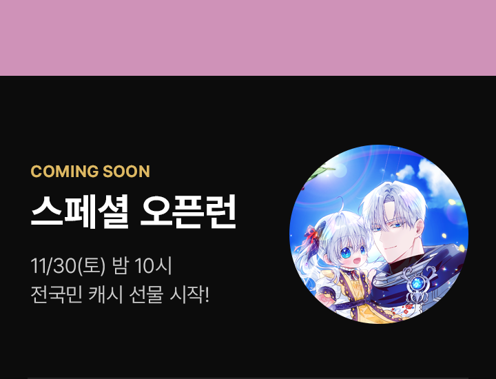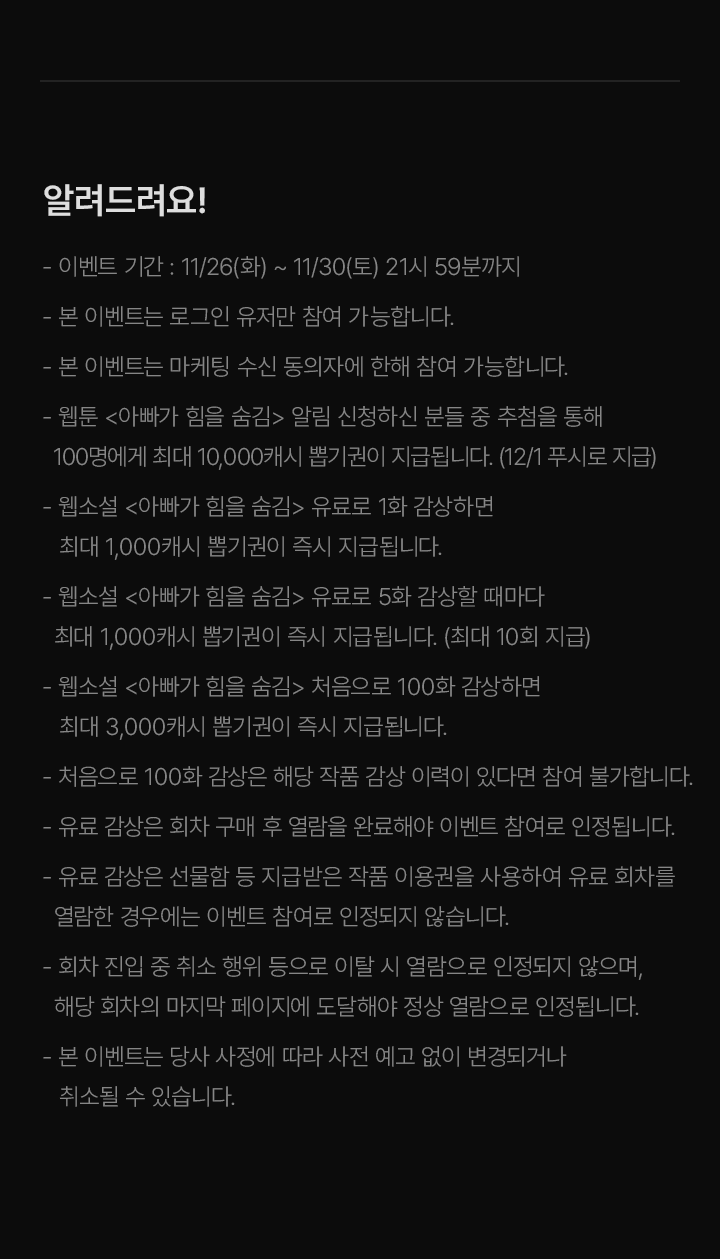 - 웹툰 <아빠가 힘을 숨김> 알림 신청하신 분들 중 추첨을 통해 100명에게 최대 10,000캐시 뽑기권이 지급됩니다. (12/1 푸시로 지급)