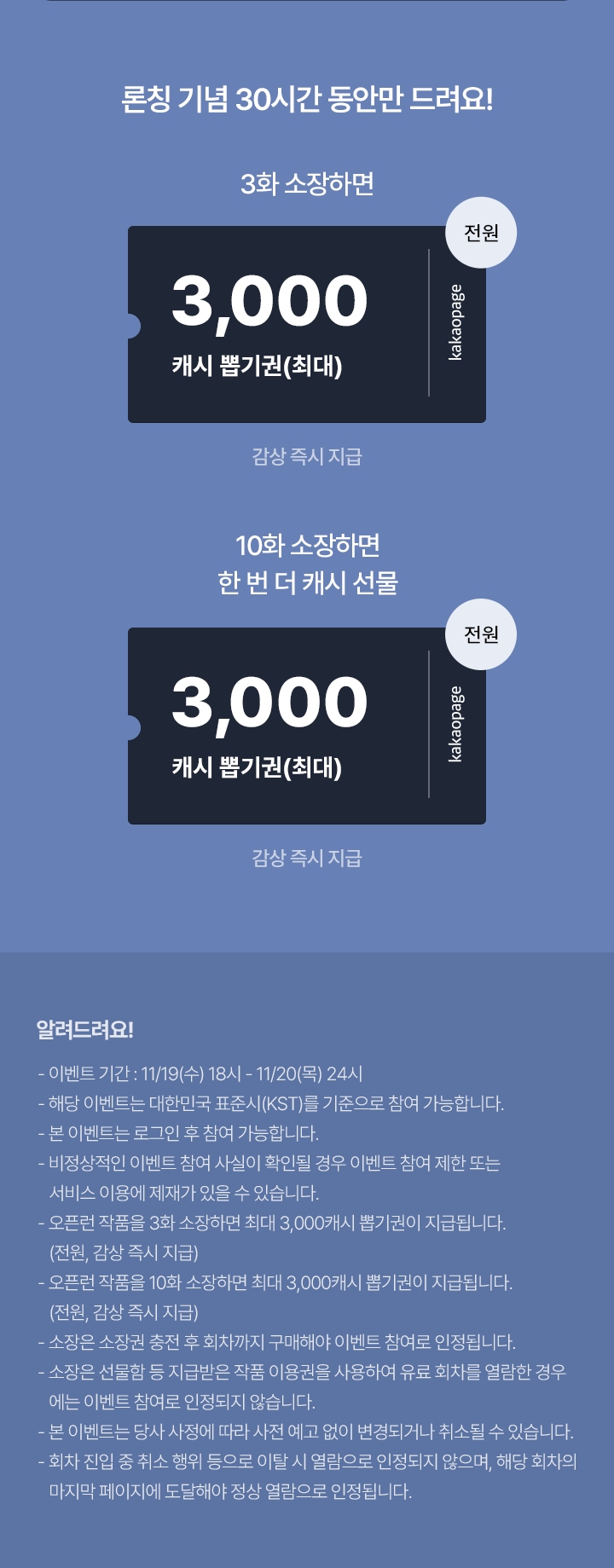 - 오픈런 작품을 유료로 3화 감상하면 최대 3,000캐시 뽑기권이 지급됩니다. (전원, 감상 즉시 지급)