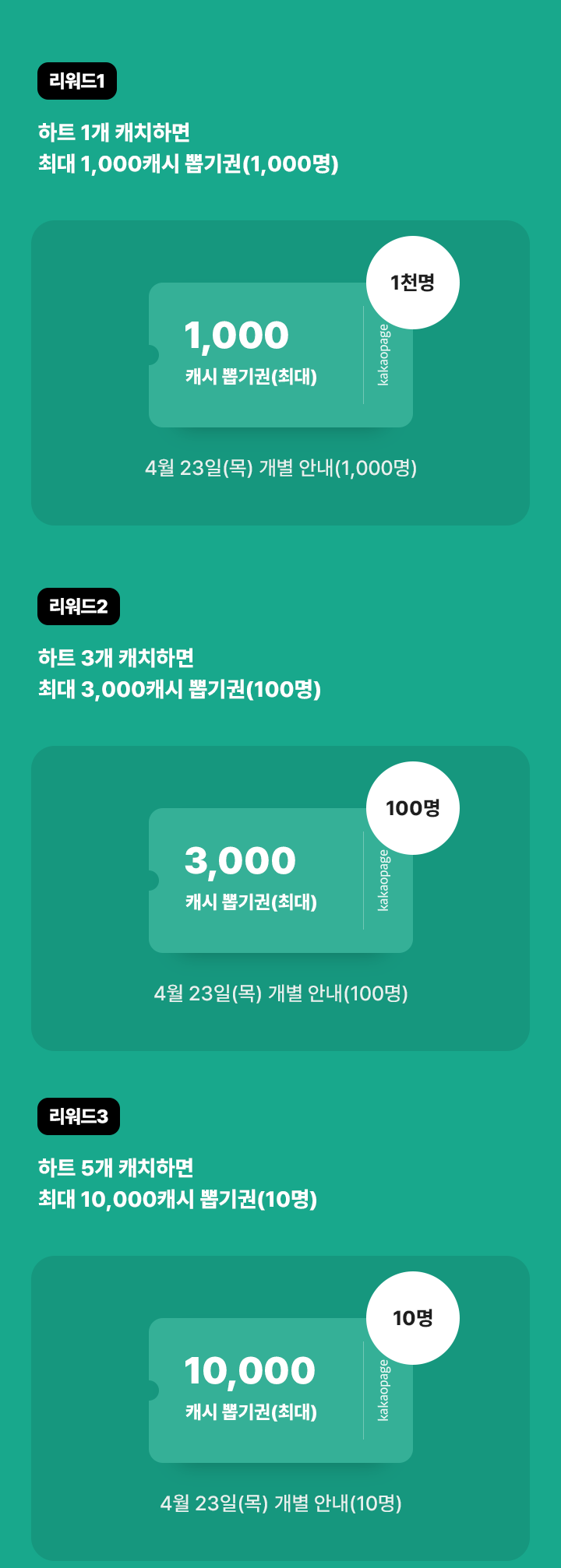 - ์ด๋ฒคํธ ๊ธฐ๊ฐ ๋ด ํํธ๋ฅผ 3๊ฐ ๋ชจ์ ์, ์ต๋ 3์ฒ ์บ์๊ฐ ๋น์ฒจ๋ ์ ์๋ ๋ฝ๊ธฐ๊ถ์ด 4์ 23์ผ(๋ชฉ)์ ํธ์๋ก ์ง๊ธ๋ฉ๋๋ค.(100๋ช