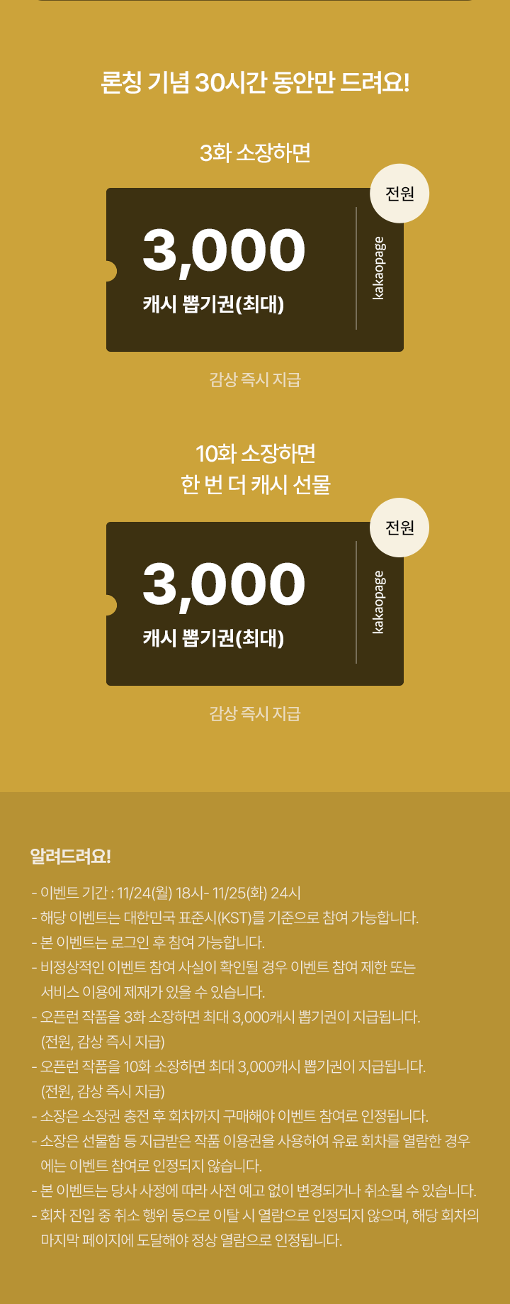- 오픈런 작품을 유료로 10화 감상하면 최대 3,000캐시 뽑기권이 즉시 지급됩니다. (전원, 감상 즉시 지급)