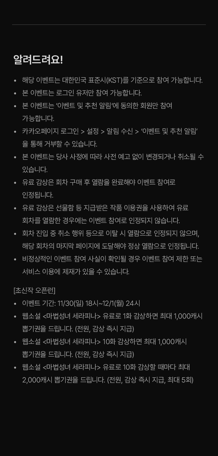 - 웹소설 <마법성녀 세라피나> 유료로 10화 감상할 때마다 최대 2,000캐시 뽑기권을 드립니다. (전원, 감상 즉시 지급)