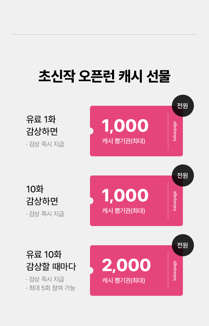 - 유료 1화 감상하면 최대 1,000캐시 뽑기권 (전원, 감상 즉시 지급)
