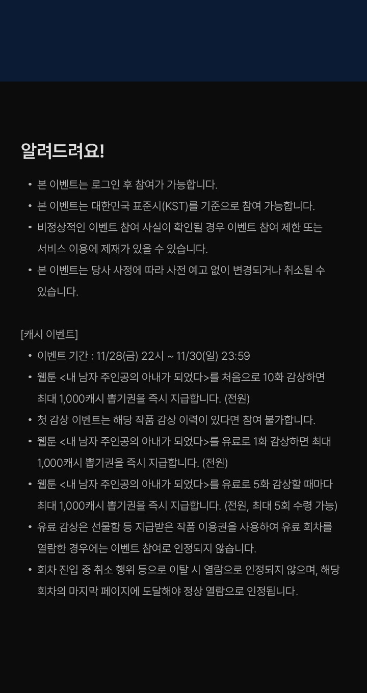 웹툰 <내 남자 주인공의 아내가 되었다>를 처음으로 10화 감상하면 최대 1,000캐시 뽑기권을 즉시 지급합니다. (전원)