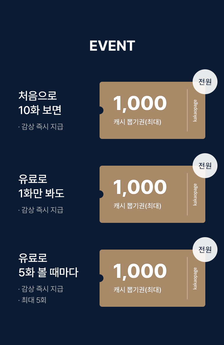 유료로 1화만 봐도 최대 1,000캐시 뽑기권 (전원, 감상 즉시 지급)