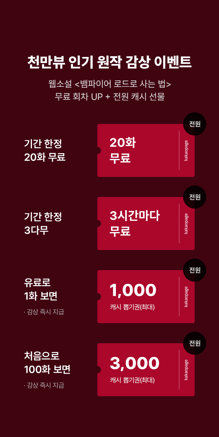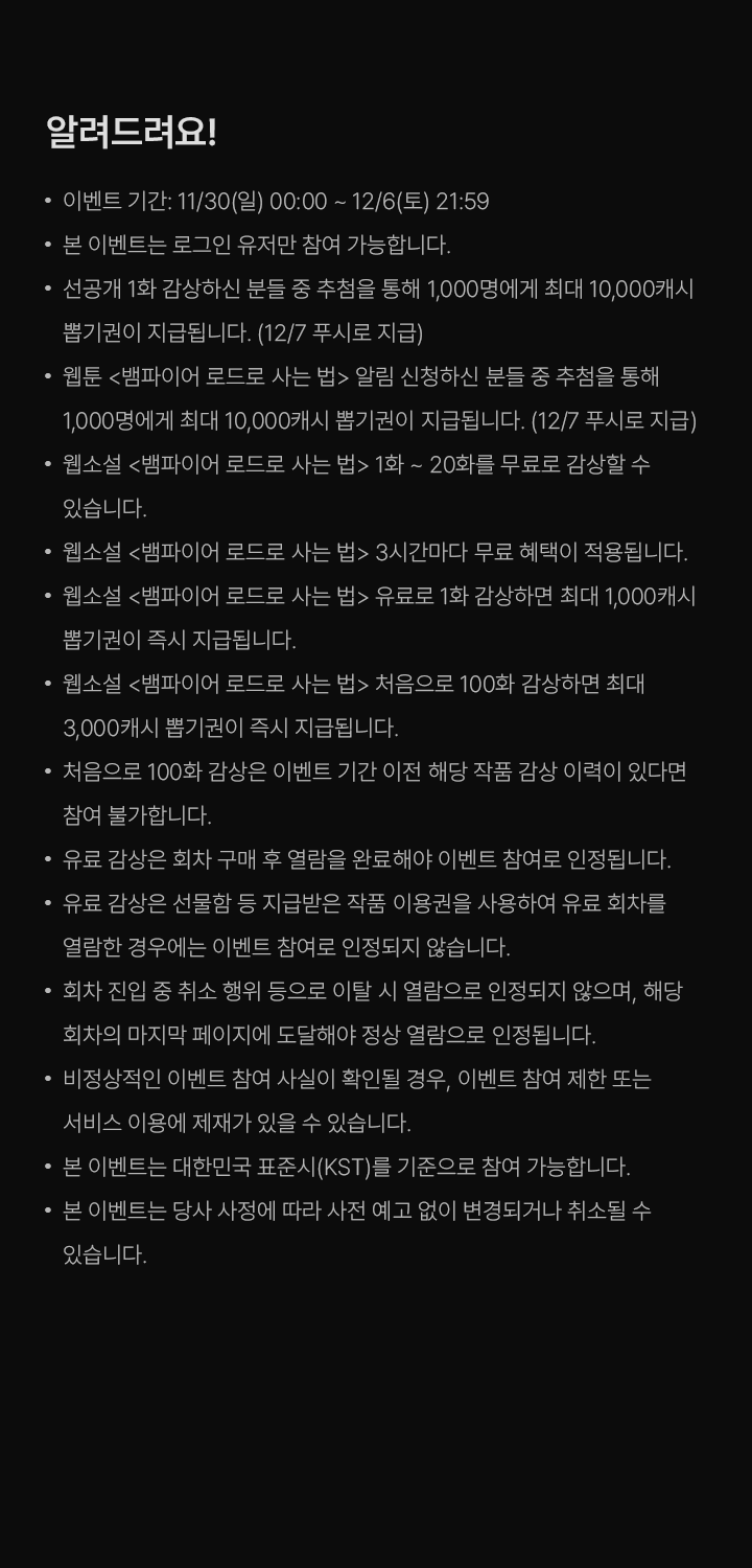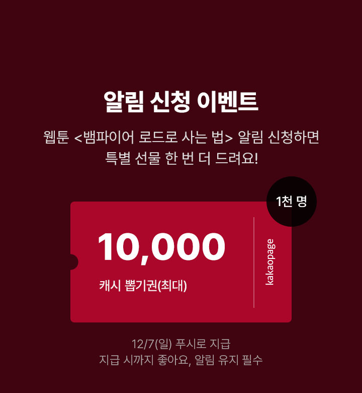 • 웹툰 <뱀파이어 로드로 사는 법> 알림 신청하신 분들 중 추첨을 통해 1,000명에게 최대 10,000캐시 뽑기권이 지급됩니다. (12/1 푸시로 지급)