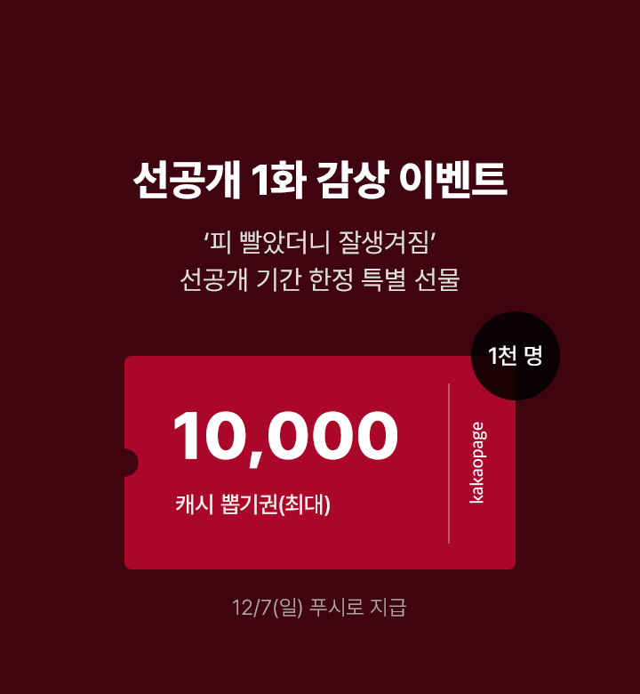 • 선공개 1화 감상하신 분들 중 추첨을 통해 1,000명에게 최대 10,000캐시 뽑기권이 지급됩니다. (12/1 푸시로 지급)