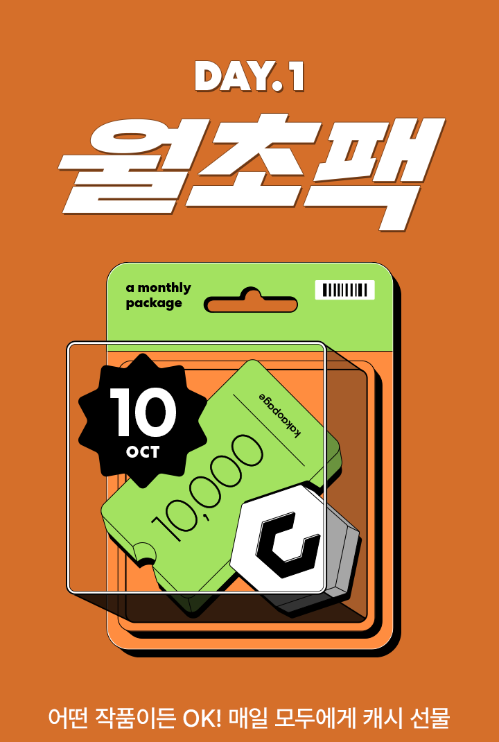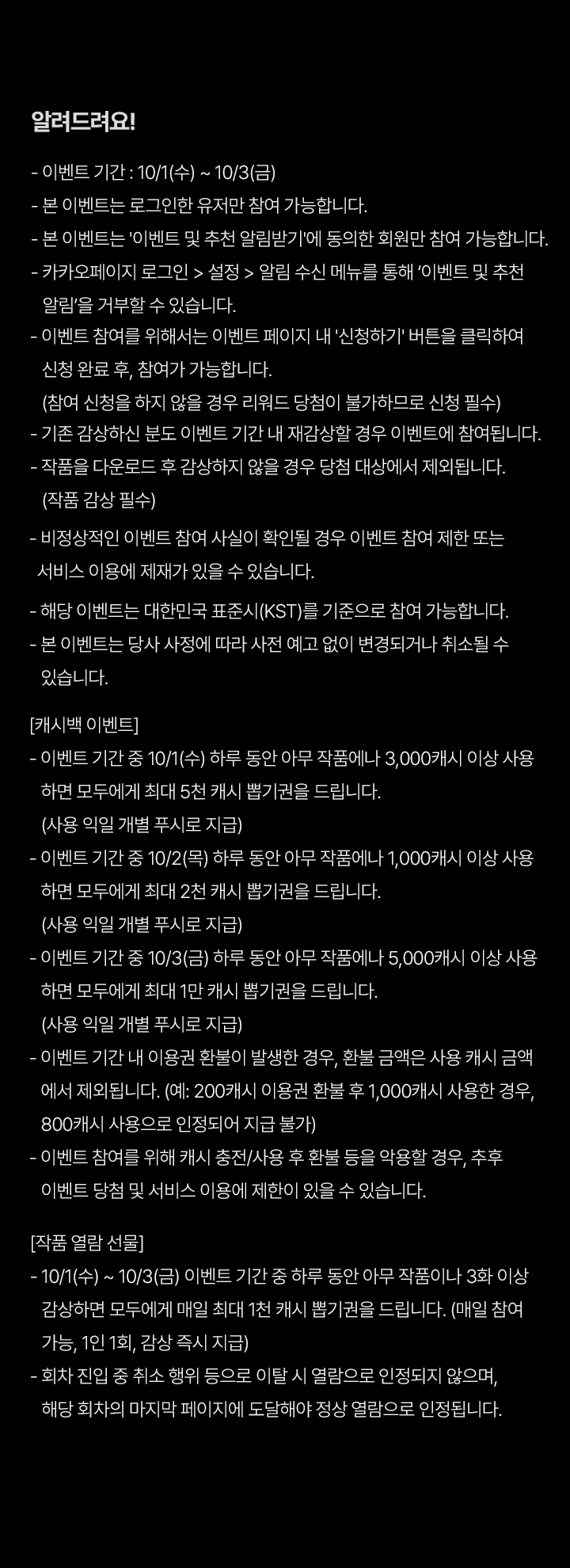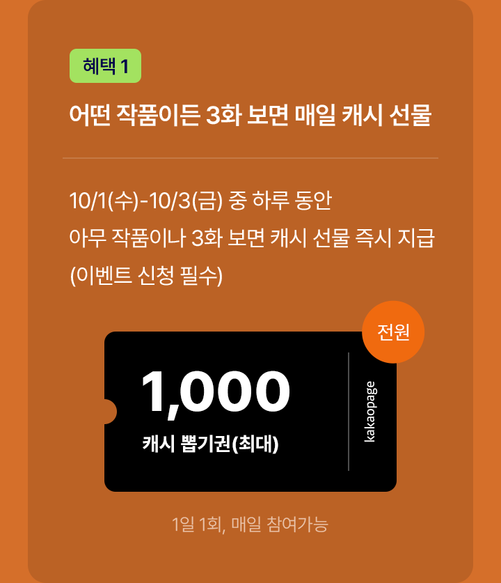 10/1(수)-10/3(금) 중 하루 동안 아무 작품이나 3화 보면 캐시 선물 즉시 지급 (이벤트 신청 필수, 전원, 최대 1,000캐시 뽑기권, 1일 1회, 매일 참여 가능)