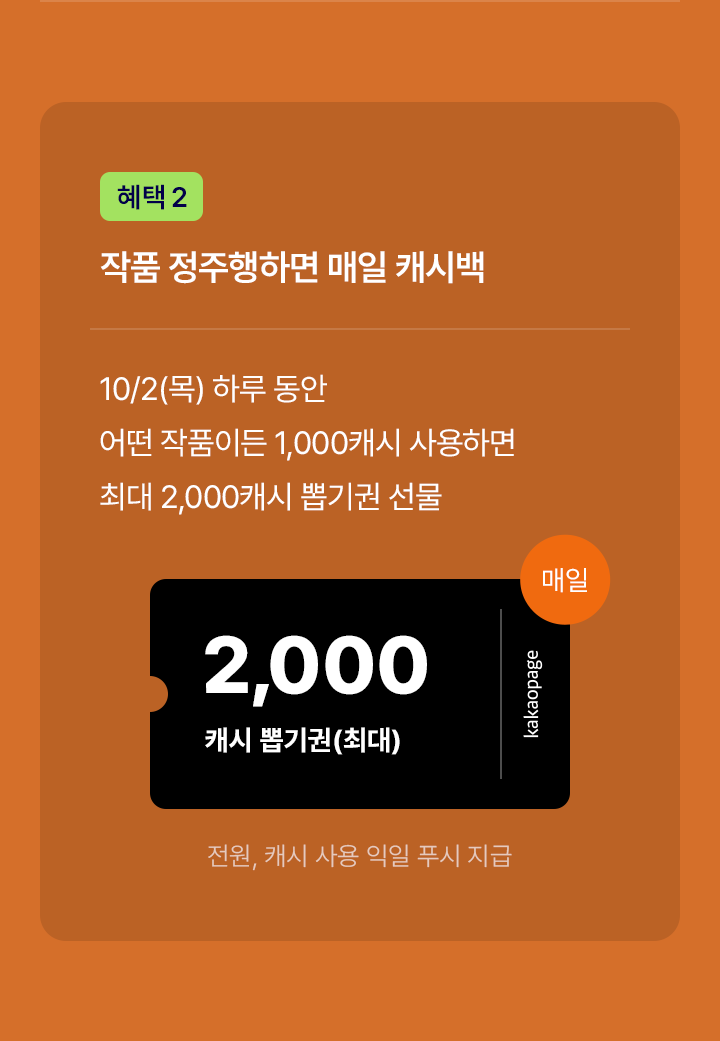 10/2(목) 하루 동안 어떤 작품이든 2,000캐시 사용하면 최대 4,000캐시 뽑기권 선물 (전원, 매일, 캐시 사용 익일 푸시 지급)