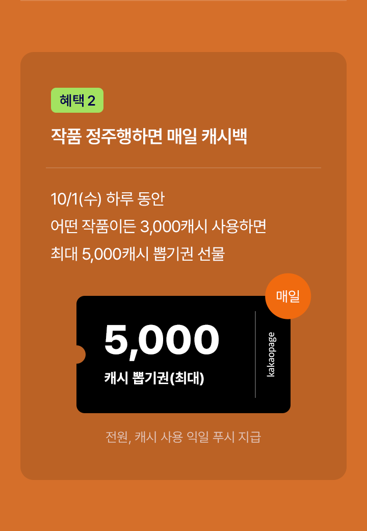 10/1(수) 하루 동안 어떤 작품이든 3,000캐시 사용하면 최대 5,000캐시 뽑기권 선물 (전원, 매일, 캐시 사용 익일 푸시 지급)