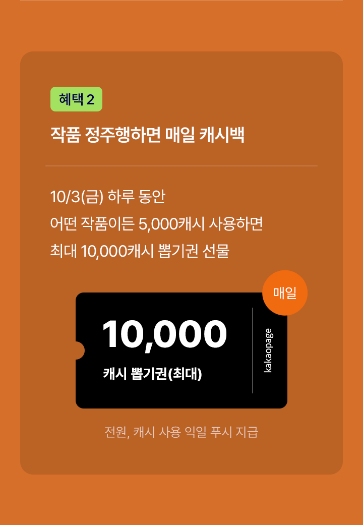 10/3(금) 하루 동안 어떤 작품이든 5,000캐시 사용하면 최대 10,000캐시 뽑기권 선물 (전원, 매일, 캐시 사용 익일 푸시 지급)