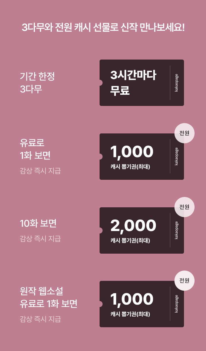 원작 웹소설 유료로 1화 보면, 최대 1,000캐시 뽑기권 (전원, 감상 즉시 지급)