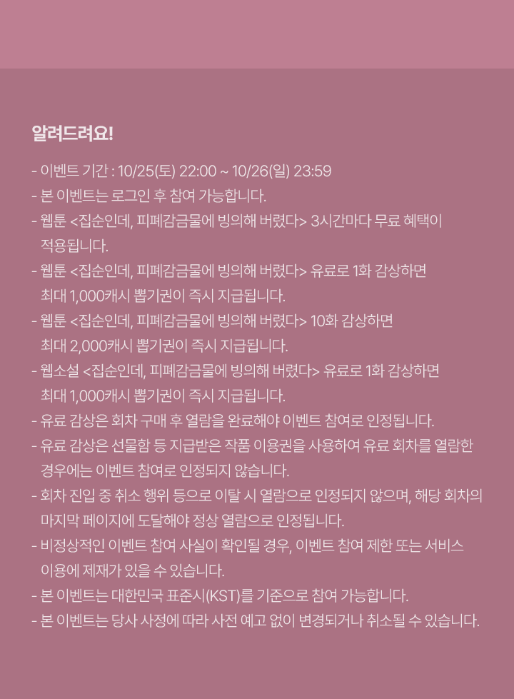 - 웹툰 <집순인데, 피폐감금물에 빙의해 버렸다> 10화 감상하면 최대 2,000캐시 뽑기권이 즉시 지급됩니다.