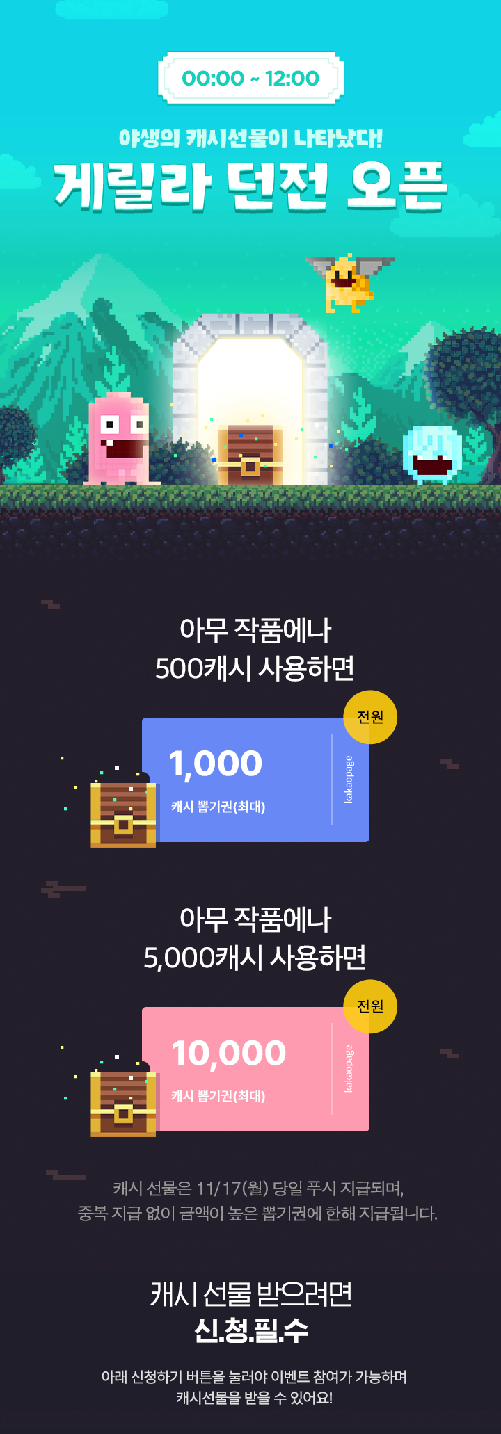 - 이벤트 기간 동안 아무 작품이나 500캐시 이상 사용하면, 최대 1천 캐시 뽑기권이 당일 지급됩니다. (전원, 푸시 지급)