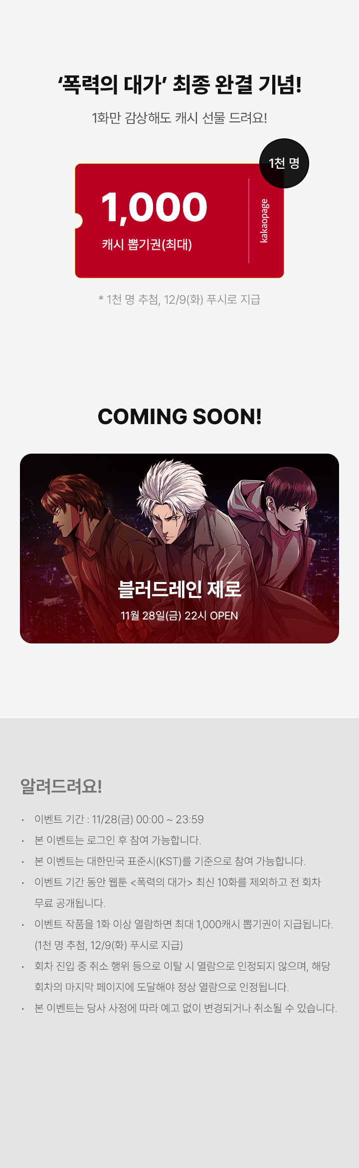 1화 이상 감상하면, 최대 1,000캐시 뽑기권 (1천명)