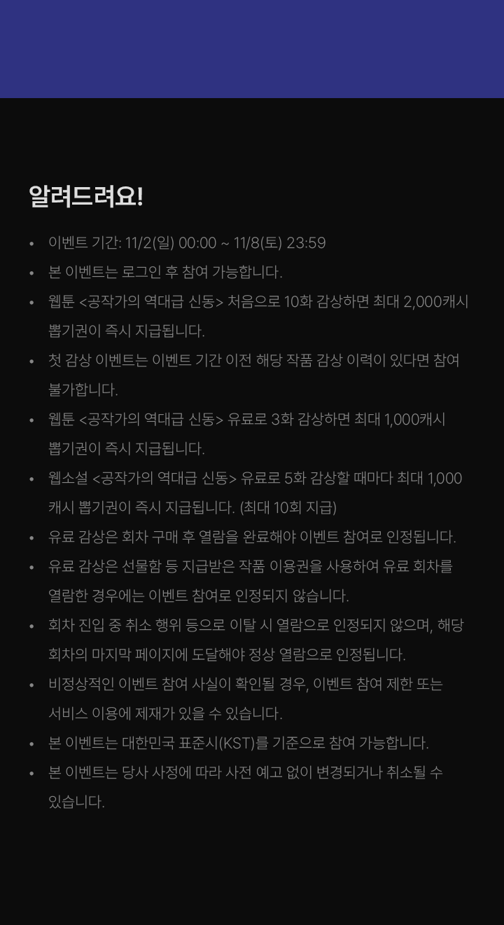 유료 감상은 회차 구매 후 열람을 완료해야 이벤트 참여로 인정됩니다.