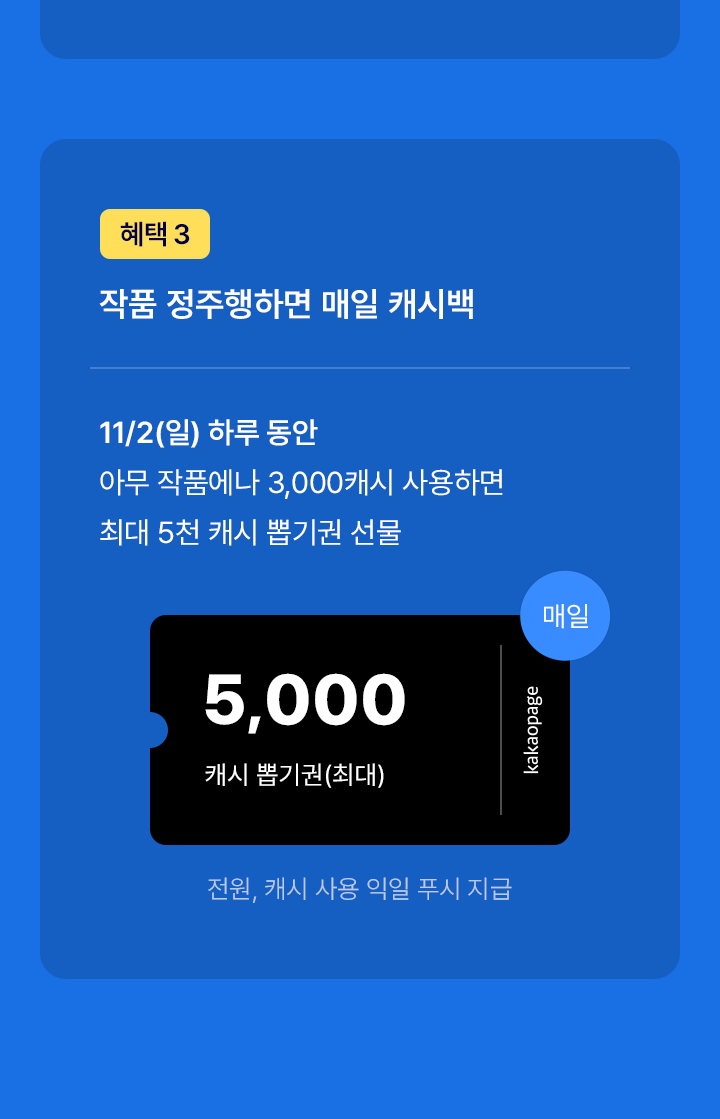 - 이벤트 기간 중 11/3(월) 하루 동안 아무 작품에나 3,000캐시 이상 사용하면 모두에게 최대 5천캐시 뽑기권을 드립니다. (사용 익일 개별 푸시로 지급)