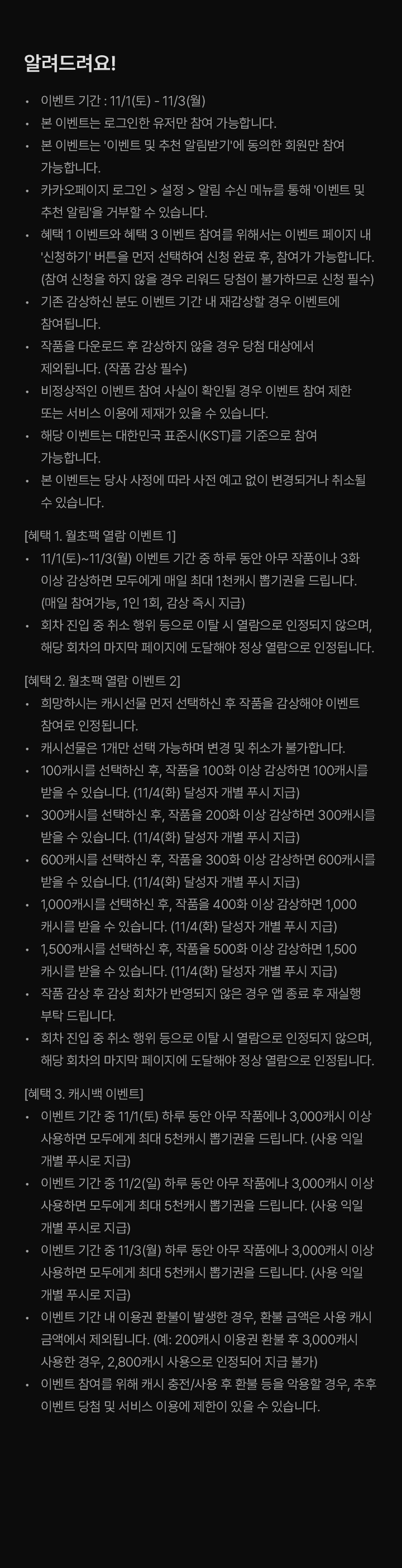 - 11/1(토)~11/3(월) 이벤트 기간 중 하루 동안 아무 작품이나 3화 이상 감상하면 모두에게 매일 최대 1천캐시 뽑기권을 드립니다. (매일 참여가능, 1인 1회, 감상 즉시 지급)