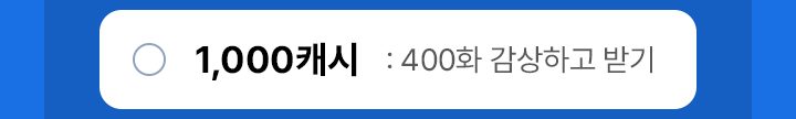 - 1,000캐시를 선택하신 후, 작품을 400화 이상 감상하면 1,000캐시를 받을 수 있습니다 (11/4(화) 달성자 개별 푸시 지급)