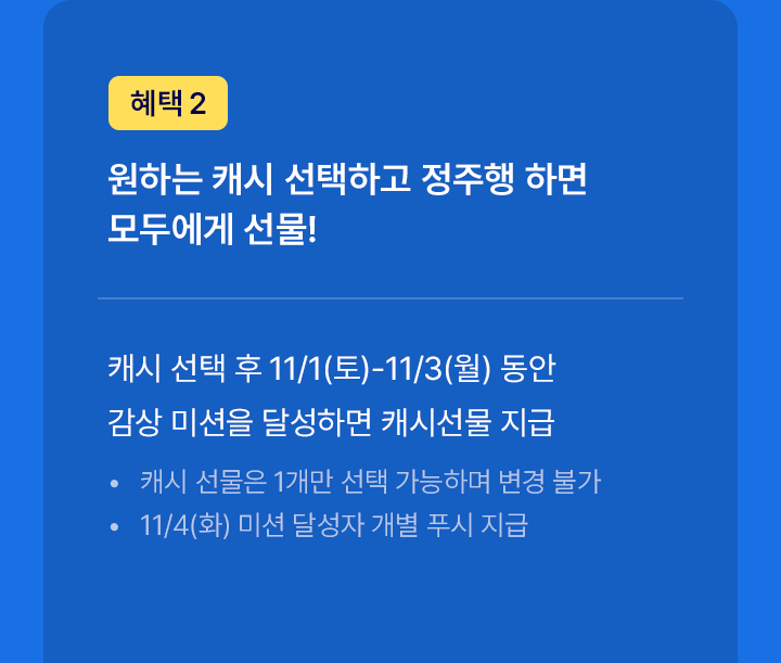 캐시 선택 후 11/1(토)-11/3(월) 동안 감상 미션을 달성하면 캐시선물 지급 (캐시 선물은 1개만 선택 가능하며 변경 불가, 11/4(화) 미션 달성자 개별 푸시 지급)
