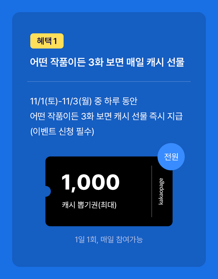 11/1(토)-11/3(월) 중 하루 동안 아무 작품이나 3화 보면 캐시 선물 즉시 지급 (이벤트 신청 필수, 전원, 최대 1,000캐시 뽑기권, 1일 1회, 매일 참여 가능)