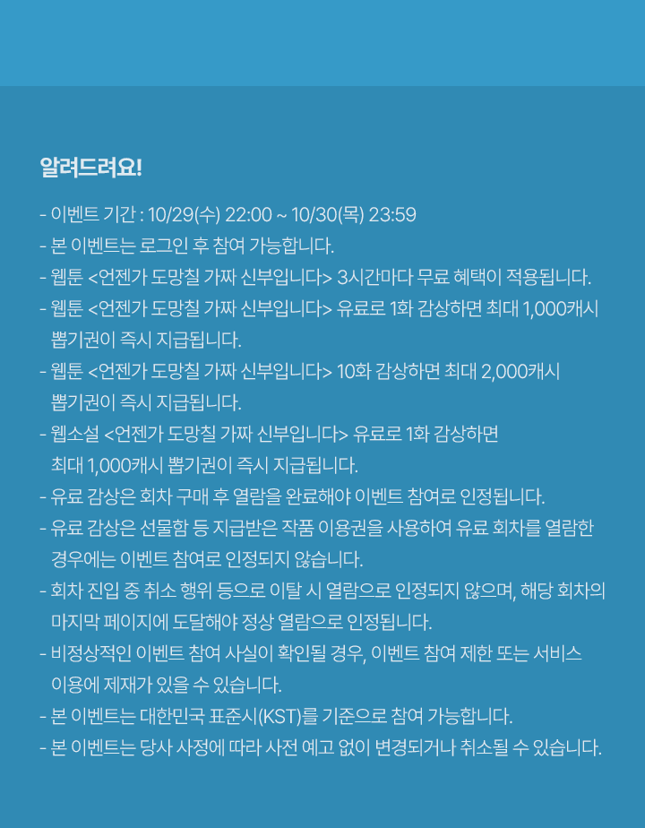 - 유료 감상은 선물함 등 지급받은 작품 이용권을 사용하여 유료 회차를 열람한 경우에는 이벤트 참여로 인정되지 않습니다.