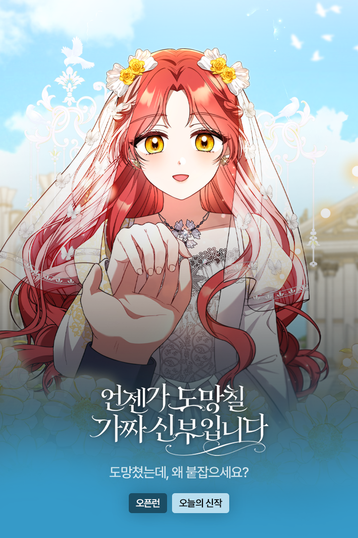 - 웹툰 <언젠가 도망칠 가짜 신부입니다> 유료로 1화 감상하면 최대 1,000캐시 뽑기권이 즉시 지급됩니다.