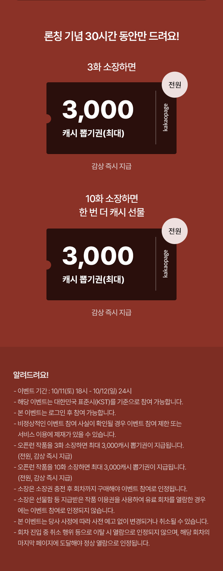 - 오픈런 작품을 유료로 10화 감상하면 최대 3,000캐시 뽑기권이 즉시 지급됩니다. (전원, 감상 즉시 지급)