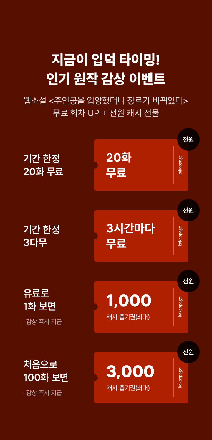 • 처음으로 100화 보면, 최대 3,000캐시 뽑기권 (전원, 감상 즉시 지급)