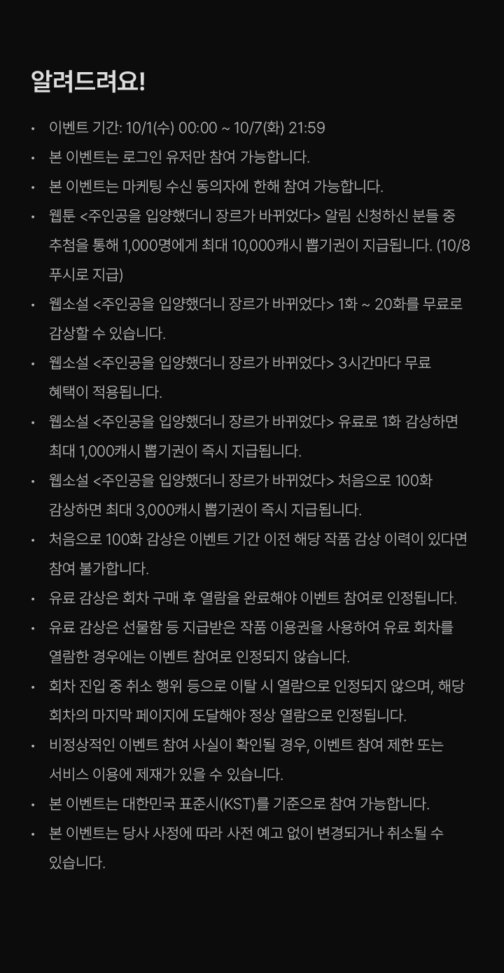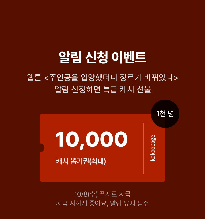 • - 웹툰 <주인공을 입양했더니 장르가 바뀌었다> 알림 신청하신 분들 중 추첨을 통해 1,000명에게 최대 10,000캐시 뽑기권이 지급됩니다. (10/8 푸시로 지급)