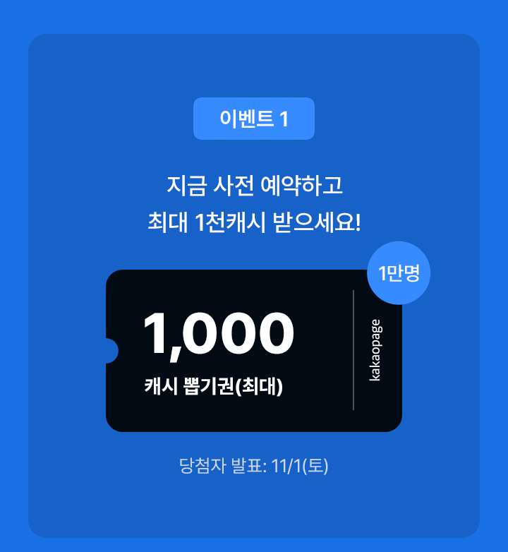 지금 사전 예약하고 최대 1천캐시 받으세요! (최대 1,000캐시 뽑기권, 1만명 추첨, 당첨자 발표 : 11/1(토))