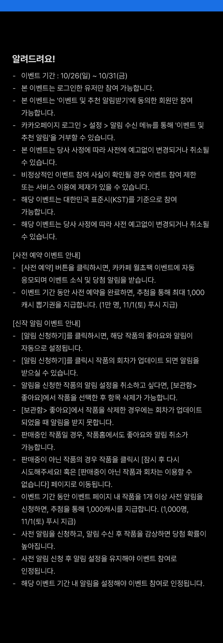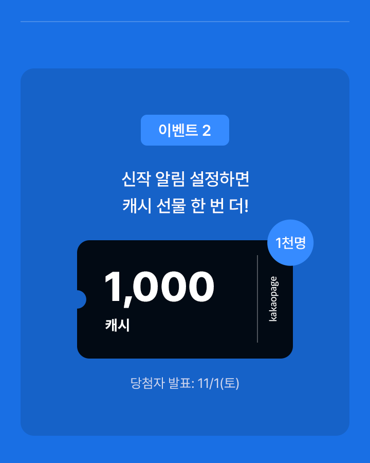 신작 알림 설정하면 캐시 선물 한 번 더! (최대 1,000캐시 뽑기권, 1천명 추첨, 당첨자 발표 : 11/1(토))