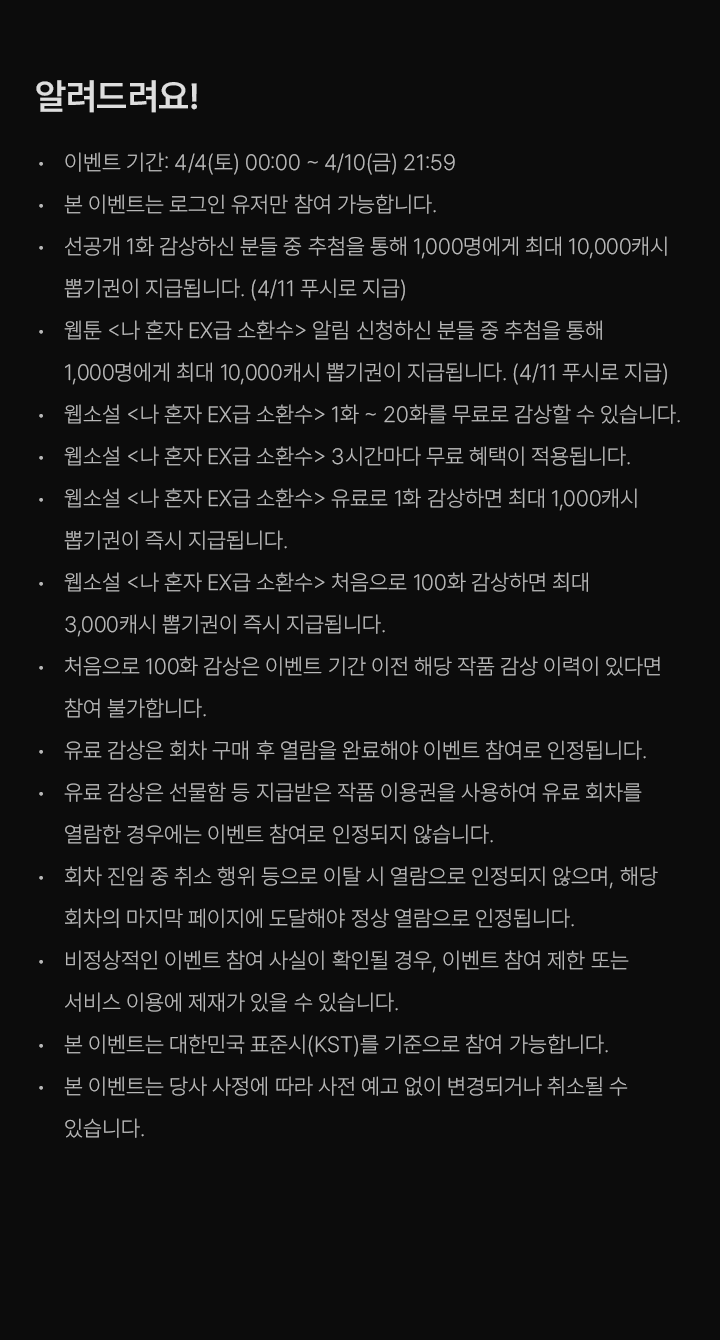 - 웹툰 <나 혼자 EX급 소환수> 알림 신청하신 분들 중 추첨을 통해 1,000명에게 최대 10,000캐시 뽑기권이 지급됩니다. (4/11 푸시로 지급)