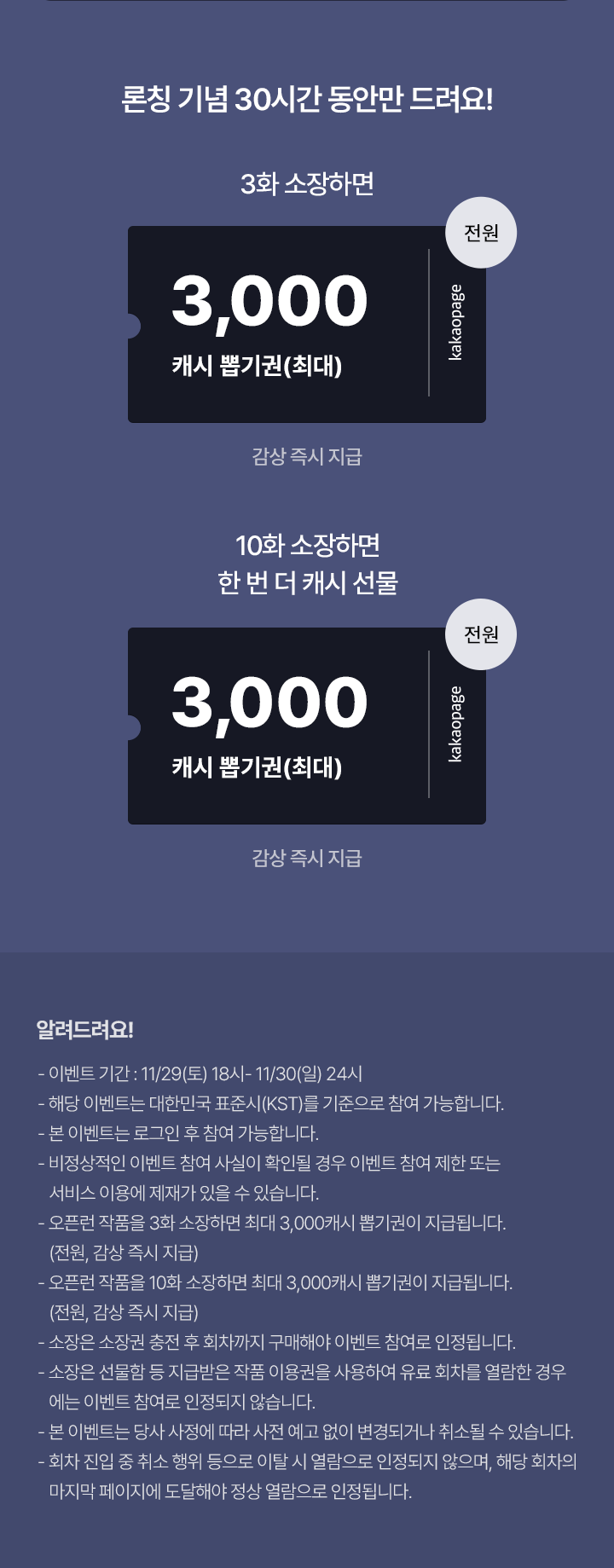- 오픈런 작품을 유료로 10화 감상하면 최대 3,000캐시 뽑기권이 즉시 지급됩니다. (전원, 감상 즉시 지급)