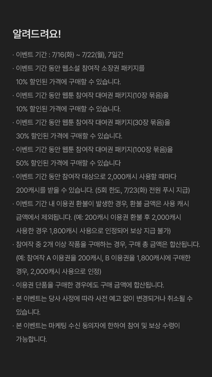 - - 이벤트 기간 동안 웹소설 참여작 소장권 패키지를 10% 할인된 가격에 구매할 수 있습니다.