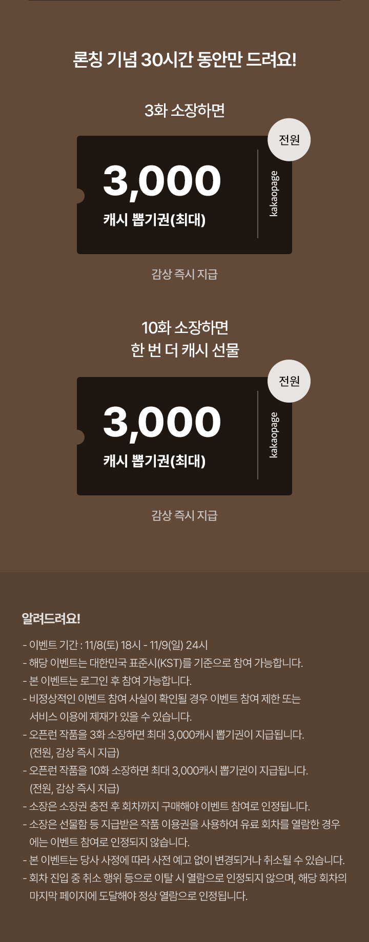 유료로 3화 보면, 최대 3,000캐시 뽑기권 (전원, 감상 즉시 지급)