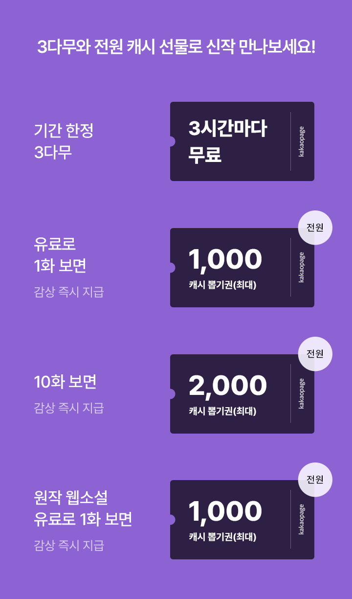 유료로 1화 보면, 최대 1,000캐시 뽑기권 (전원, 감상 즉시 지급)