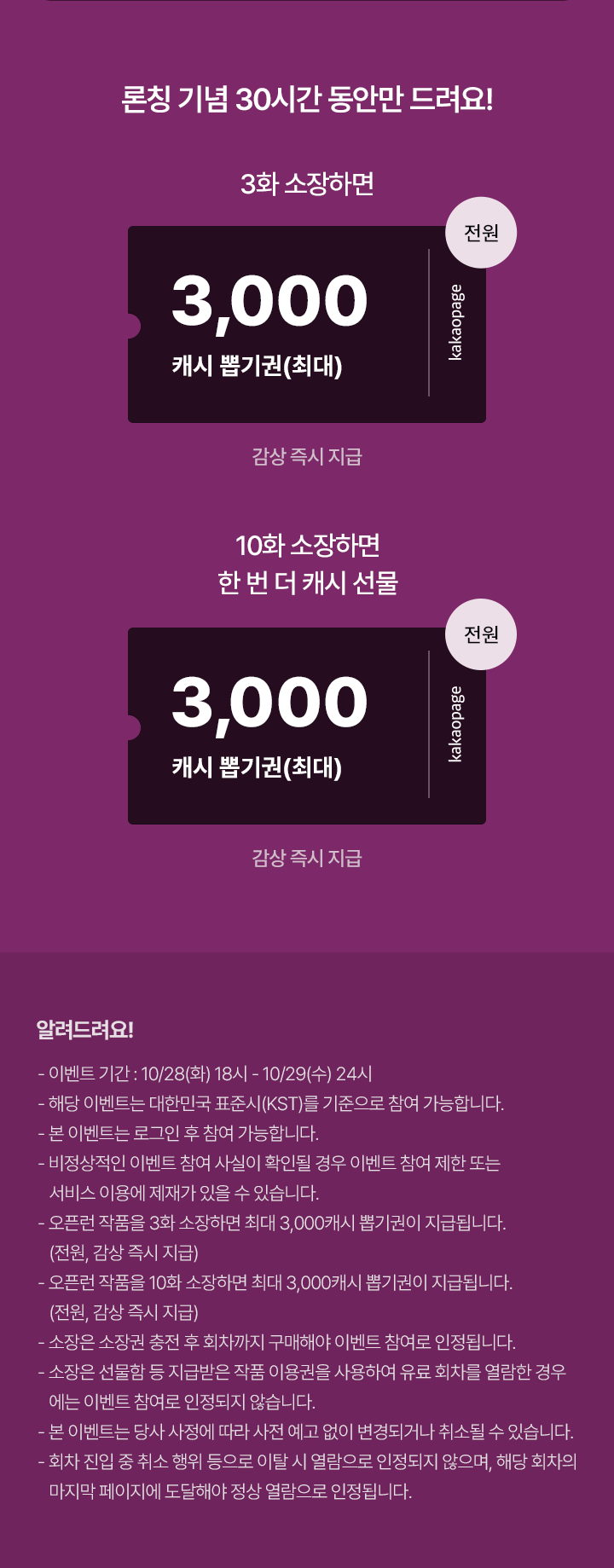 유료로 3화 보면, 최대 3,000캐시 뽑기권 (전원, 감상 즉시 지급)