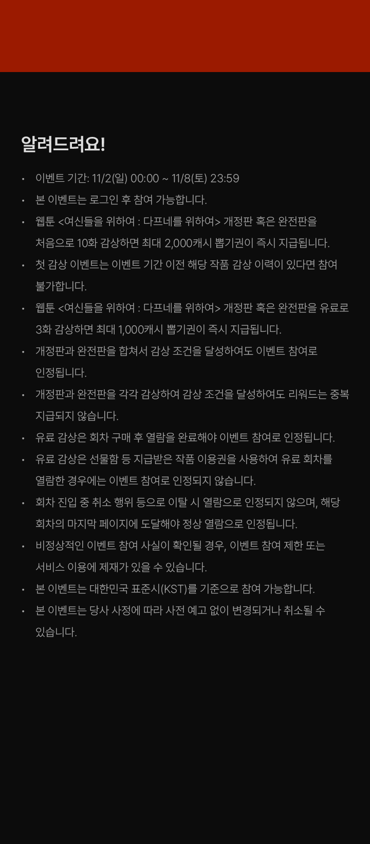 유료 감상은 선물함 등 지급받은 작품 이용권을 사용하여 유료 회차를 열람한 경우에는 이벤트 참여로 인정되지 않습니다.