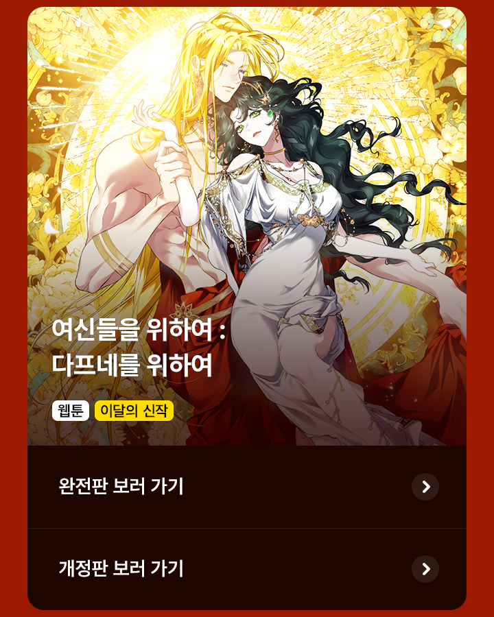 웹툰 <여신들을 위하여 : 다프네를 위하여> 일반판 혹은 완전판을 처음으로 10화 감상하면 최대 2,000캐시 뽑기권이 즉시 지급됩니다.