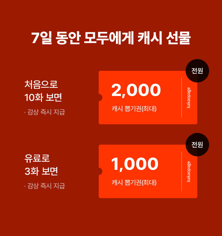 웹툰 유료로 3화 보면 최대 1,000캐시 뽑기권 (전원, 감상 즉시 지급)