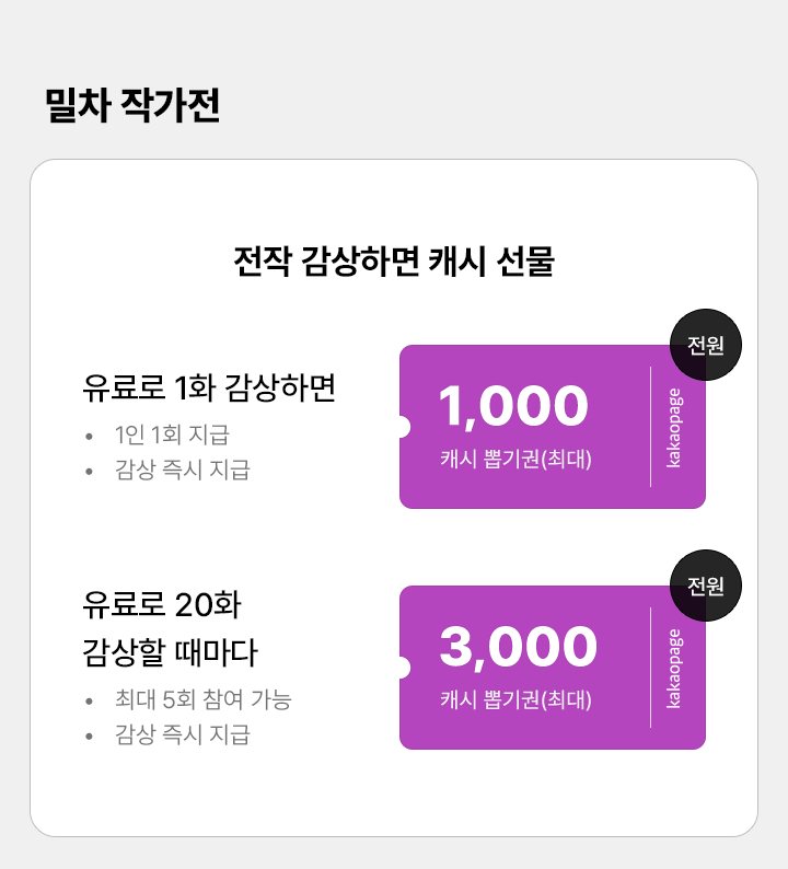 • 유료로 20화 감상할 때마다 전원 최대 3,000캐시 뽑기권, 최대 5회 참여 가능, 감상 즉시 지급