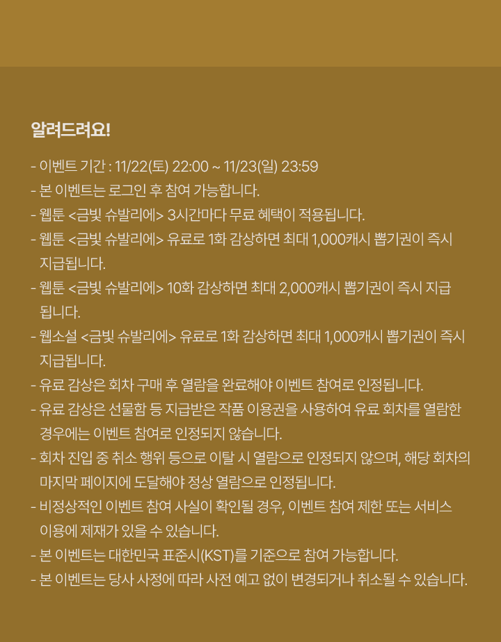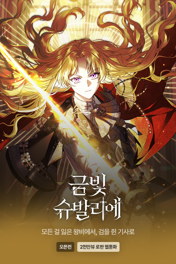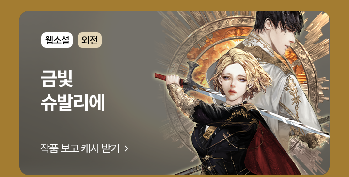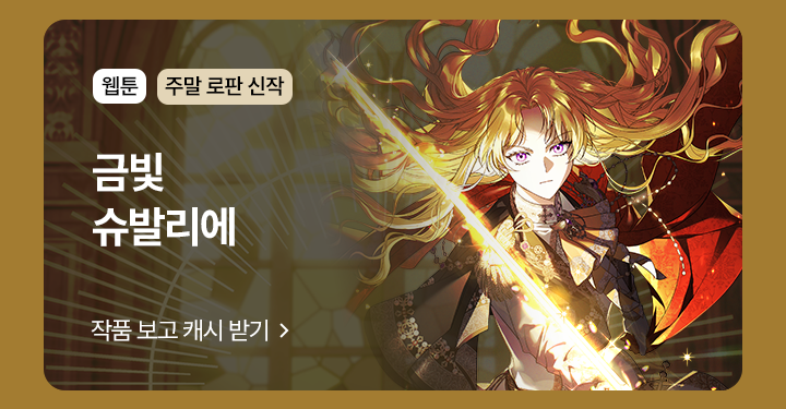 - 웹소설 <금빛 슈발리에> 유료로 1화 감상하면 최대 1,000캐시 뽑기권이 즉시 지급됩니다.