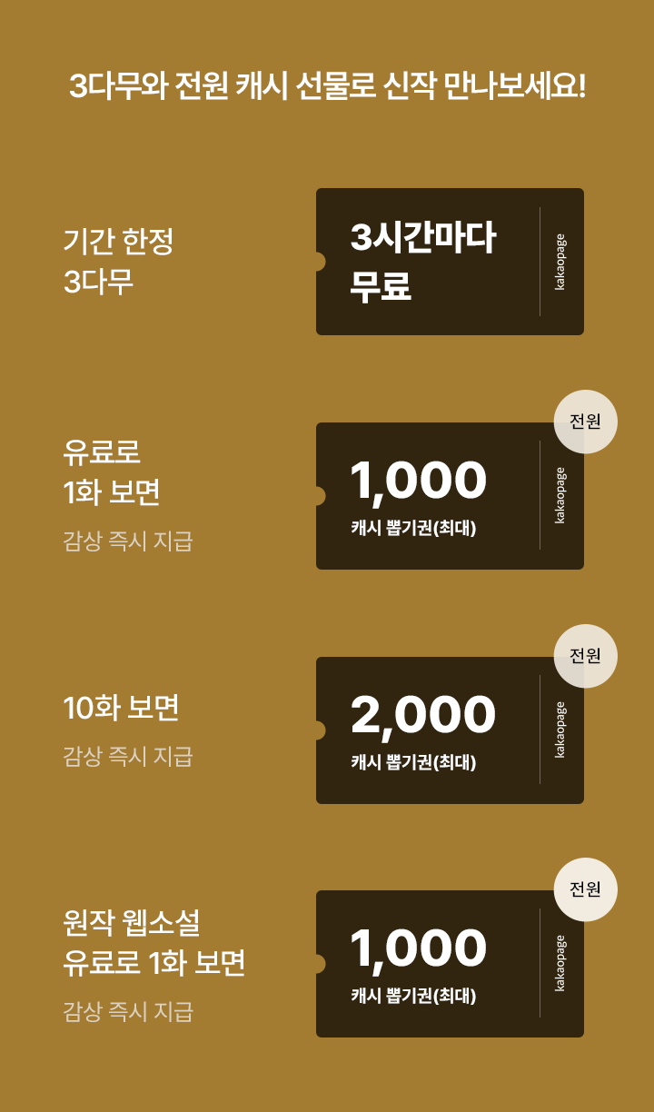 3다무와 전원 캐시 선물로 신작 만나보세요!