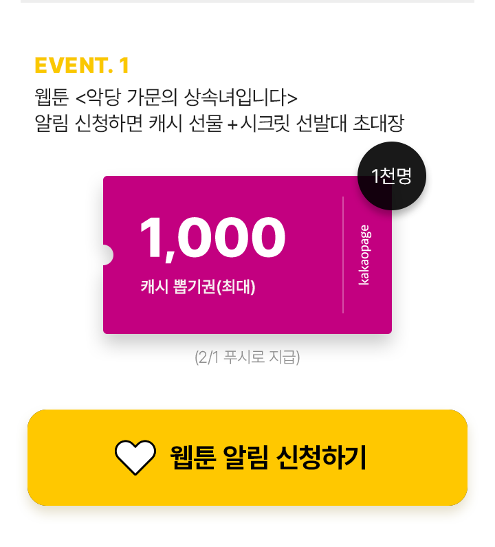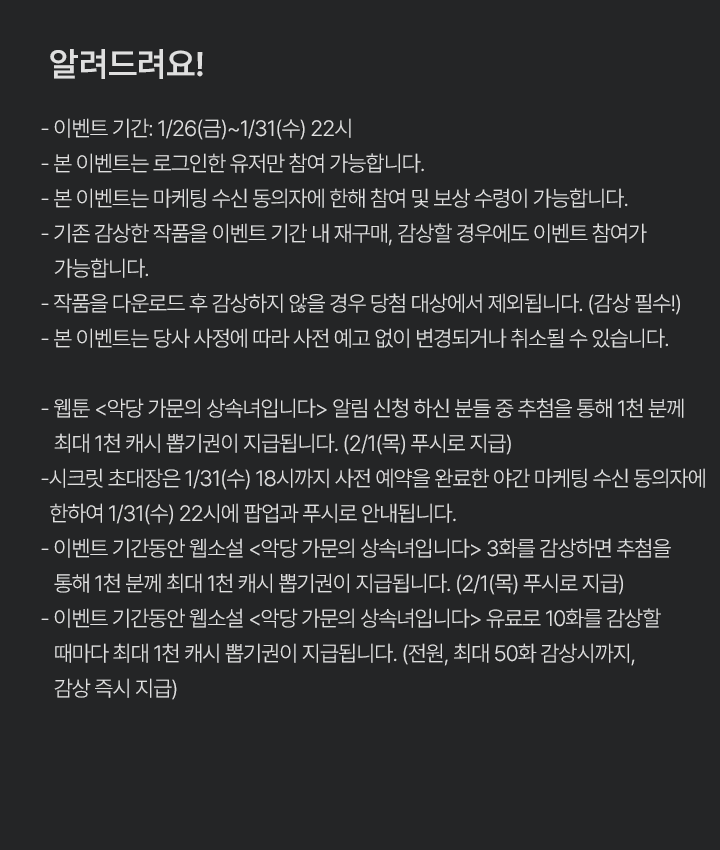 - - 웹툰 <악당 가문의 상속녀입니다> 알림 신청 하신 분들 중 추첨을 통해 1천 분께 최대 1천 캐시 뽑기권과 웹툰 론칭 후 시크릿 선발대 초대장이 지급됩니다. (시크릿 선발대 초대장: 1/31(수) 22시 지급, 캐시 뽑기권: 2/1(목) 푸시로 지급)