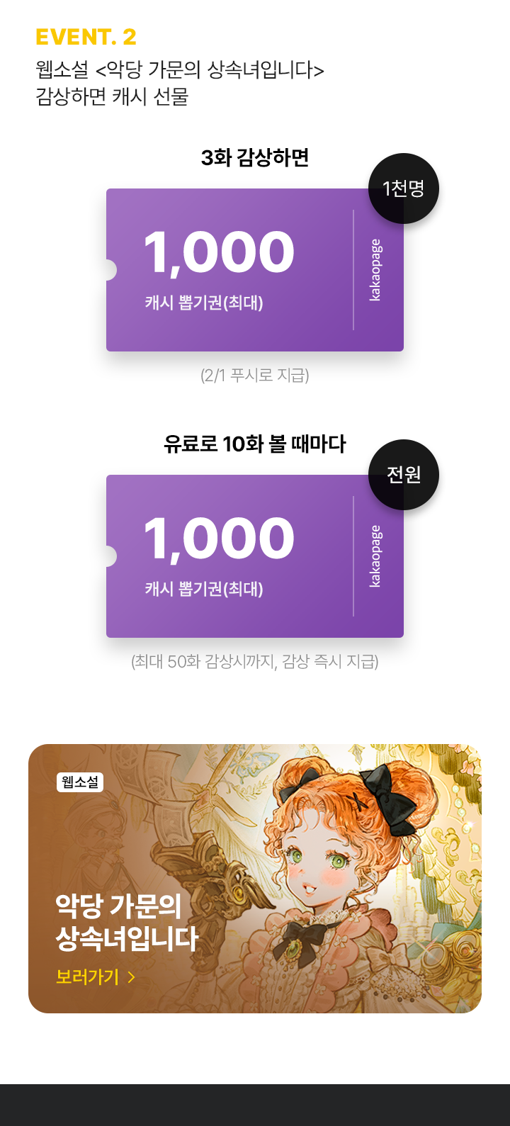 - - 이벤트 기간동안 웹소설 <악당 가문의 상속녀입니다> 3화를 감상하면 추첨을 통해 1천 분께 최대 1천 캐시 뽑기권이 지급됩니다. (2/1(목) 푸시로 지급)
